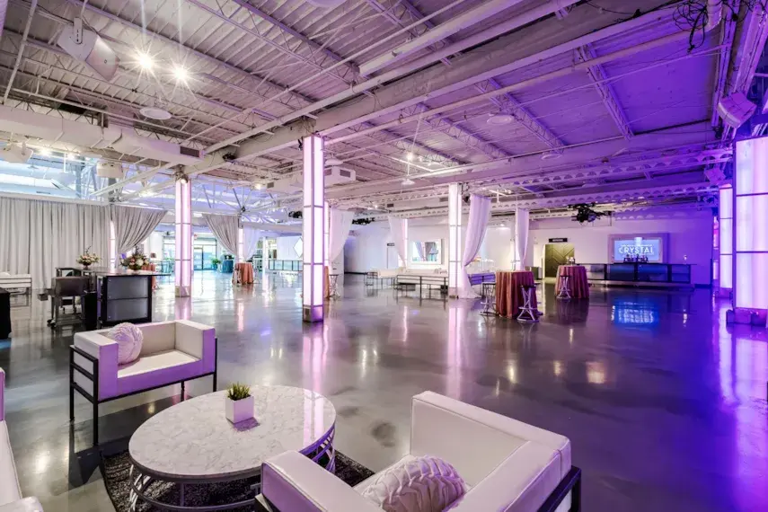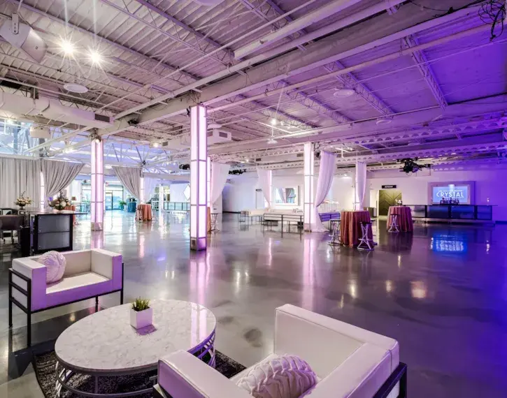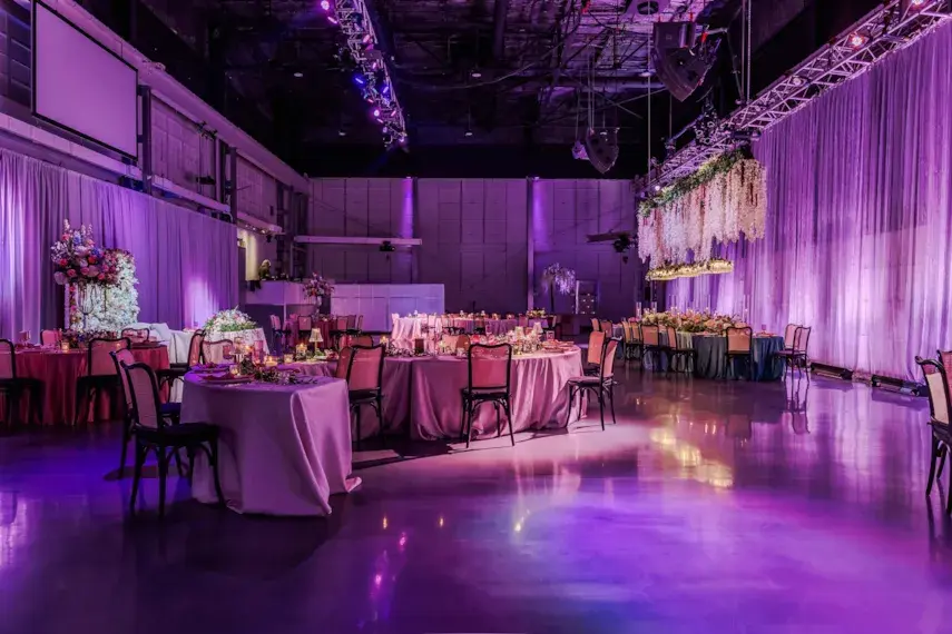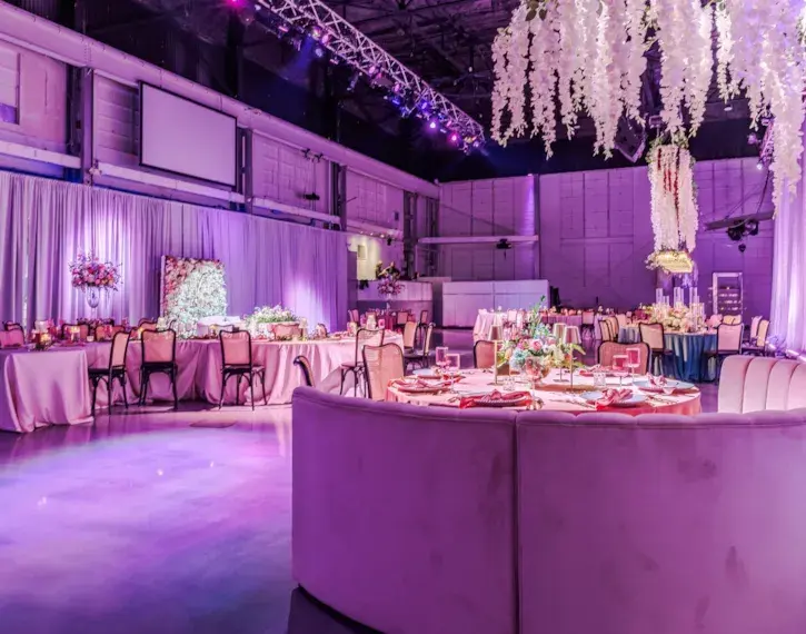 In The Center Bay, we leaned into The Crane Bay’s signature modern-industrial aesthetic. Wash lights, patterned lighting, and uplights created depth against the venue’s architectural elements. The open layout illustrated how easily lounge groupings, cocktail tables, and formal seating can coexist in one cohesive environment.