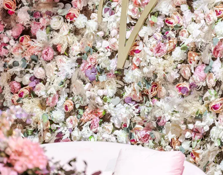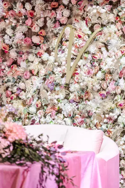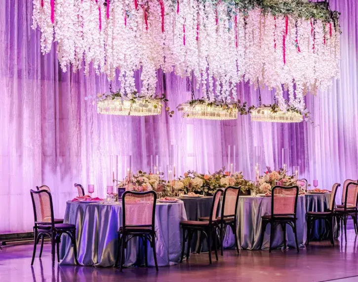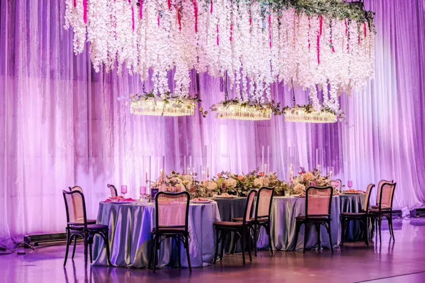 Above the tables, chandeliers were enhanced with floral installations, creating a dramatic focal point that felt both elevated and intimate. A gold shimmer drape framed a black sweetheart couch, offering a stunning backdrop moment that would be ideal for weddings, head tables, or VIP seating.