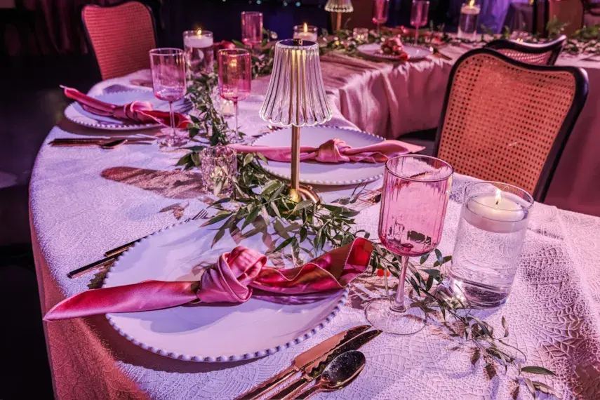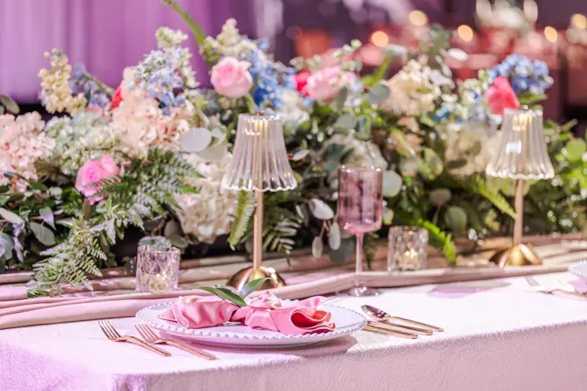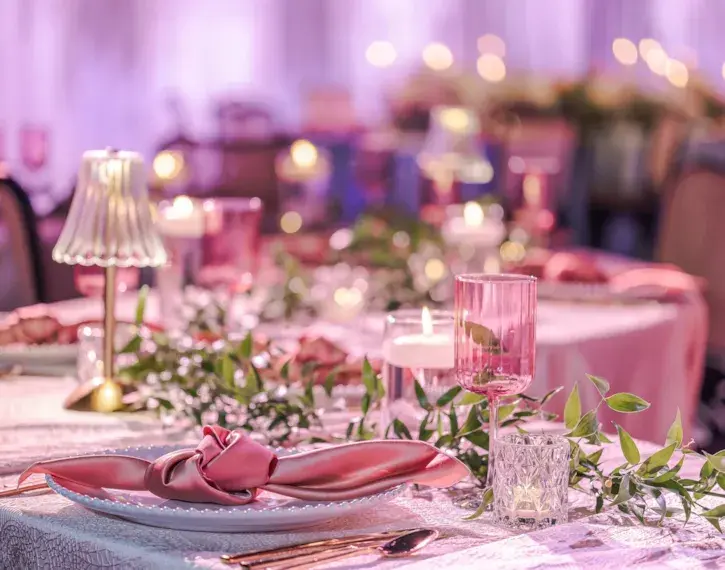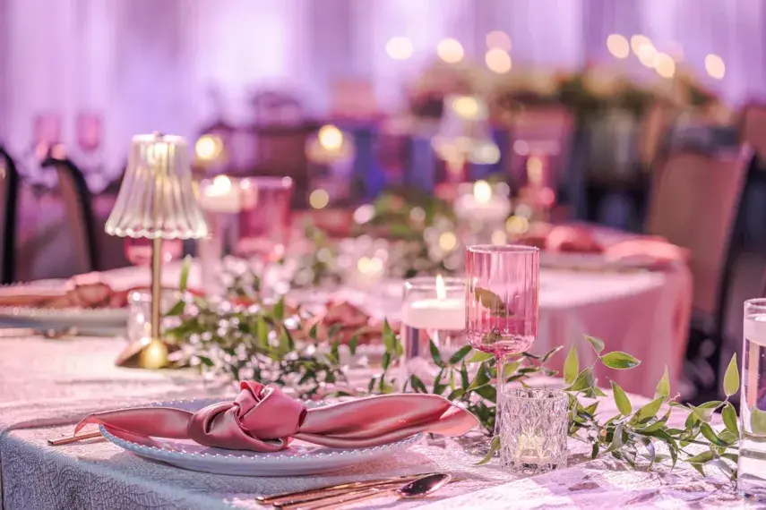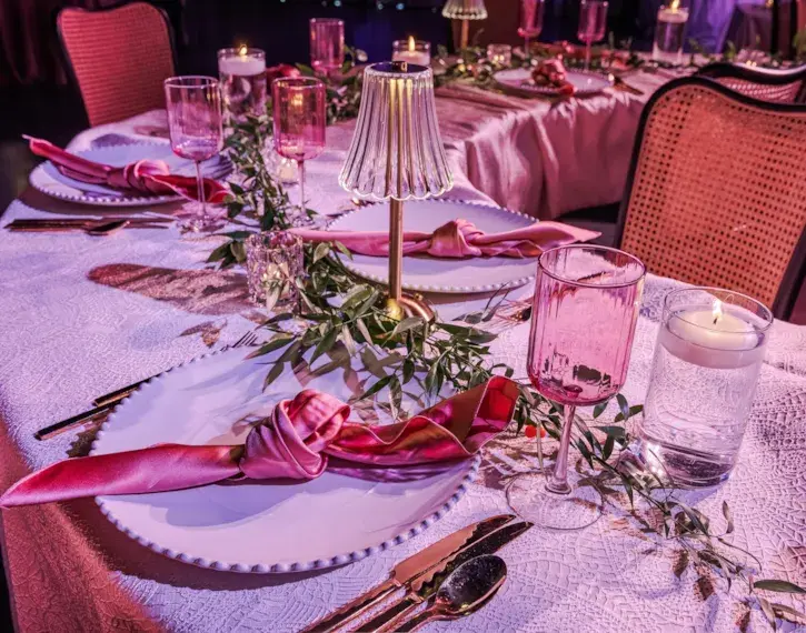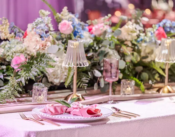 The High Bay became the heart of the design story. Draped in romantic mauves, champagne satins, ocean velvets, and lagoon hues, the space featured a mix of 6-foot rounds and serpentine tables styled with layered linens and black rattan chairs. Mauve satin napkins were vertically folded around white pearl chargers, paired with gold-accented flatware and Muse glassware for a refined finish.