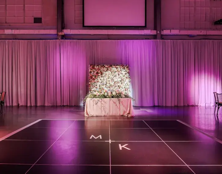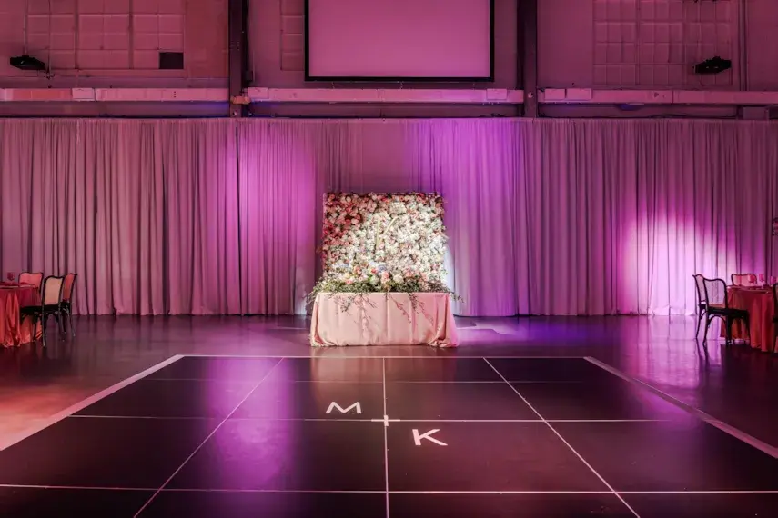 The 16’ x 16’ black dance floor anchored the room, demonstrating how The Crane Bay can seamlessly shift from formal dining to high-energy celebration. With built-in staging, LED lighted columns, and house ceiling lighting, the space can be transformed with ease - no excessive build-out required.