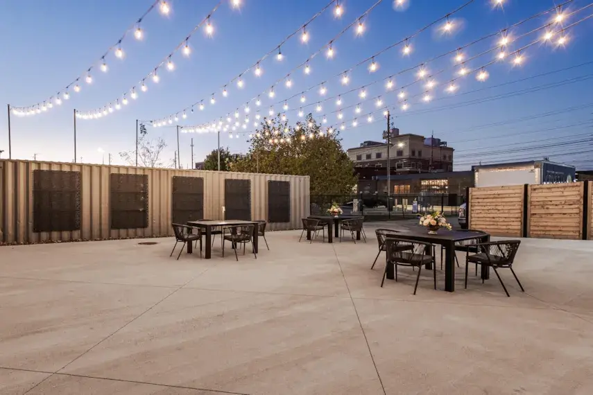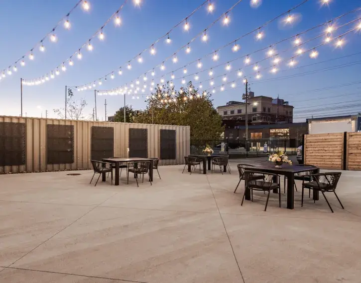 As the sun sets, both of The Crane Bay’s patios came to life under café string lighting, firepits and skyline views. Styled with black tables, cocktail groupings, and casual games like cornhole, the outdoor space illustrated how The Crane Bay blends modern city energy with romantic ambiance.