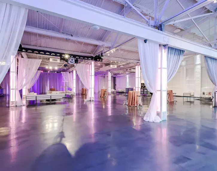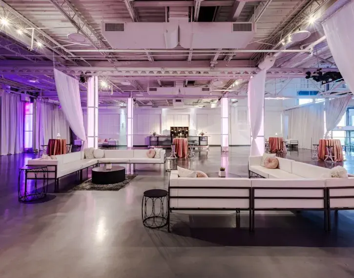 With over 5,000 square feet of total space that can be divided using our in-house draping system, The Center Bay allows planners to customize flow and guest experience without compromising design. Everything, from the glass-front bar units to white leather couch seating, is portable, allowing complete flexibility.